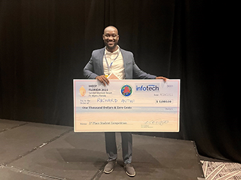 In September, the 2022 International Highway Engineering Exchange Program (IHEEP) included a student competition at its event in Fort Myers, Florida. FAMU-FSU College of Engineering student Richard Antwi was selected to represent the department in the student competition and emerged first after presenting his research titled, “Detecting Roadway Geometry Data from Roadways using Artificial Intelligence and Aerial Imagery.” Antwi is a second year civil engineering doctoral student at and a graduate research assistant at the Resilient Infrastructure and Disaster Response (RIDER) Center. His research focuses on building resilient transportation systems. He’s currently studying “Detecting School Zones on Florida’s Public Roadways Using Aerial Images and Artificial Intelligence“ and “Satellite Imagery-based Hurricane Debris Assessment on Roadways.”